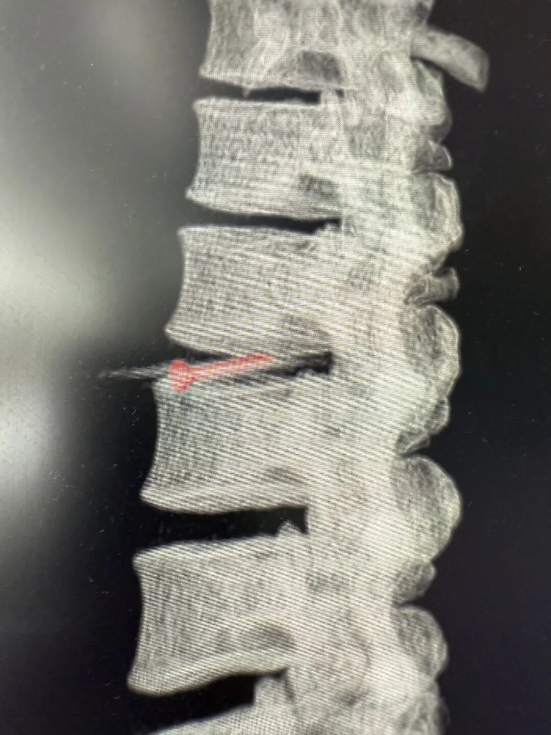 据医生介绍,钉子从腹壁到椎间盘,“走”了约40cm,疑似穿了多个腹腔脏器!